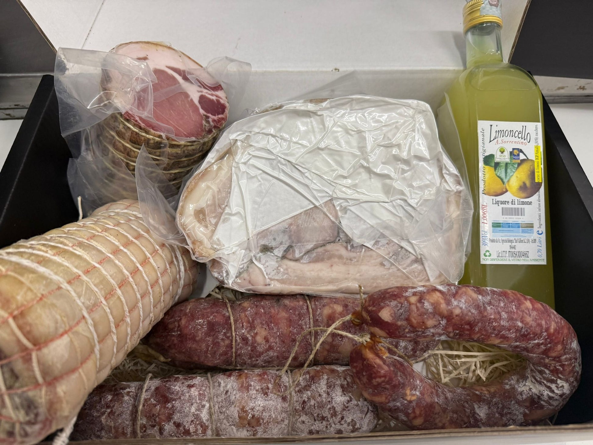 Interno: una coppia di salami 1kg, porchetta 2kg, pancetta 1kg, salsiccia stagionata 500gr, lonza 1kg + liquori/limoncello pregiato