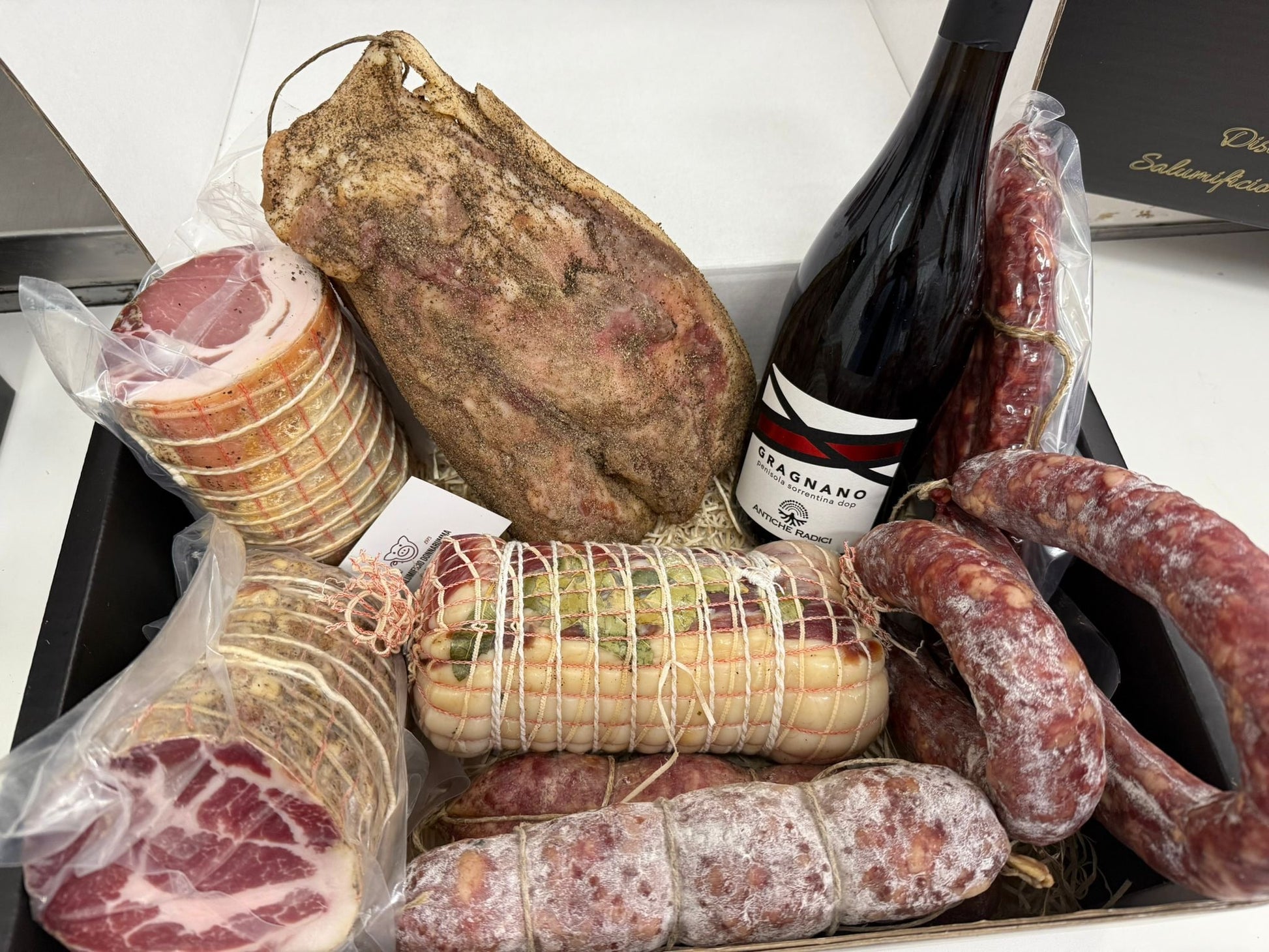 Interno: una coppia di salami 1,2kg, guanciale 1kg, pancetta 1,3kg, coppa 1,15kg, salsiccia stagionata 750gr, lonza 750gr, salsiccia piccante 1,3kg, + Gragnano DOC Rosso Antiche Radici